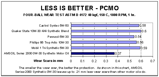 Quantity of AW additives alone, however, will not make one lubricant perform better than a competitive lubricant. It's the combination of blended synthetic basestocks with a perfectly balanced package of the highest quality additives that allows AMSOIL to consistently outperform the competition in all aspects, including wear protection.(NOTE: Perfectly balanced means that using an aftermarket oil additive will not improve and may actually harm the performance of AMSOIL motor oils.) The following results from Four Ball Wear Tests will demonstrate how effective AMSOIL Synthetic Motor Oils are at wear protection compared to other popular oils. The Four Ball Wear Test is a lubricant industry standard (ASTM D 4172) test that compares relative wear prevention characteristics of new lubricants at specified conditions. AMSOIL products clearly offer better wear protection than competitive